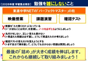 東進中学NETでは、生徒・保護者の皆様と私どもが共通の認識に立って新年度を迎えることができるように、この新年度学習方針説明会を毎年実施しています。